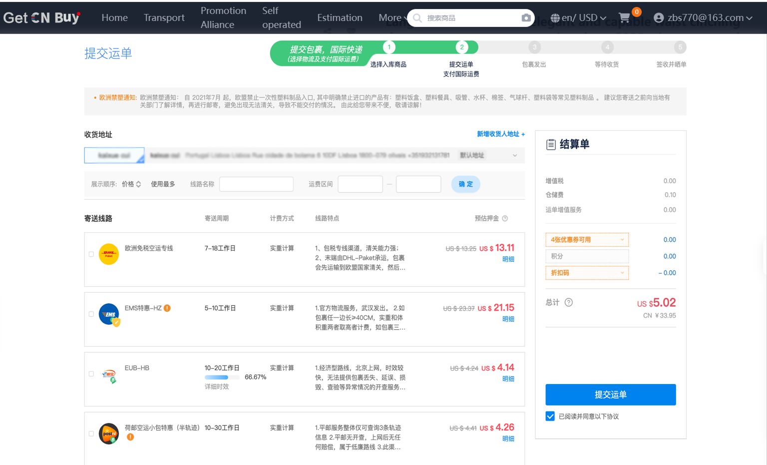In "My Warehouse", select the item and click "Submit Package", fill in the overseas recipient's address information, and choose from the recommended delivery methods
