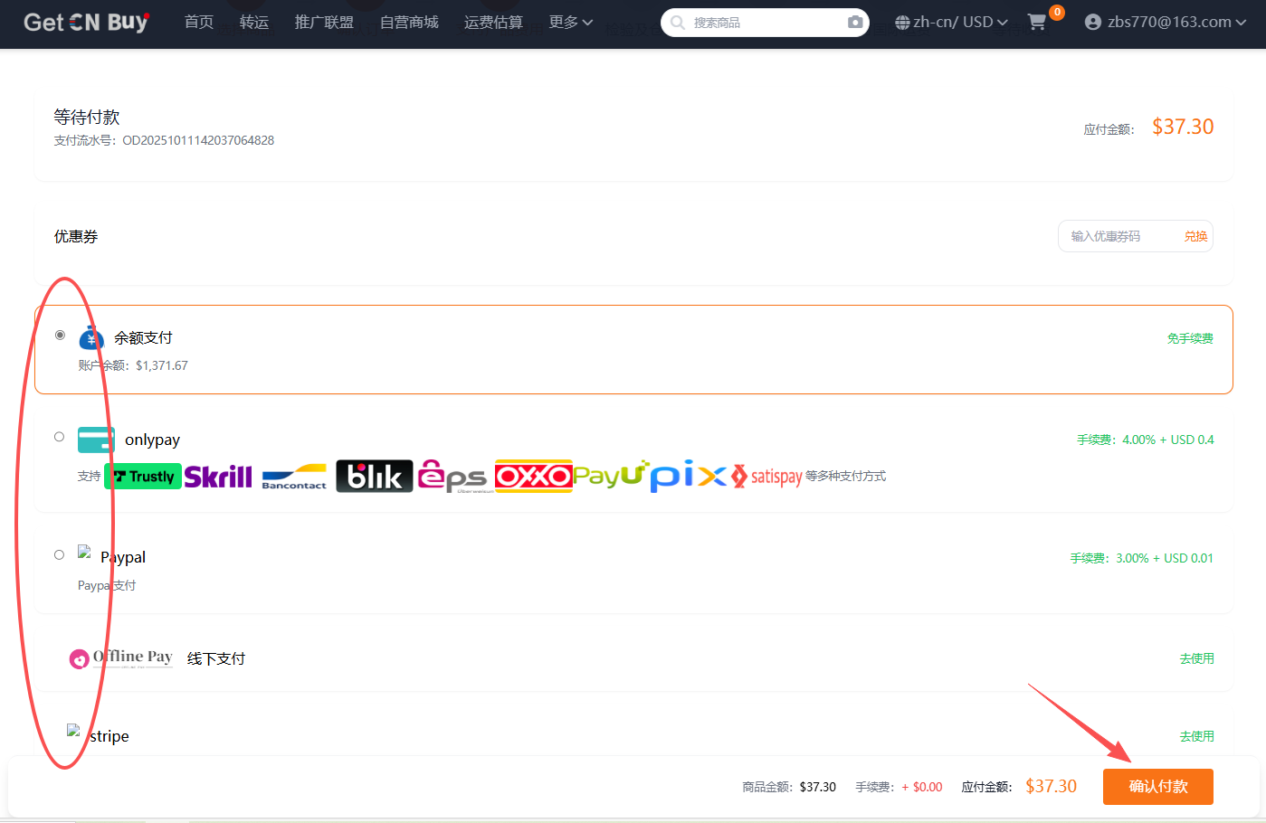 Select a payment method, pay the international shipping deposit and customs clearance fee