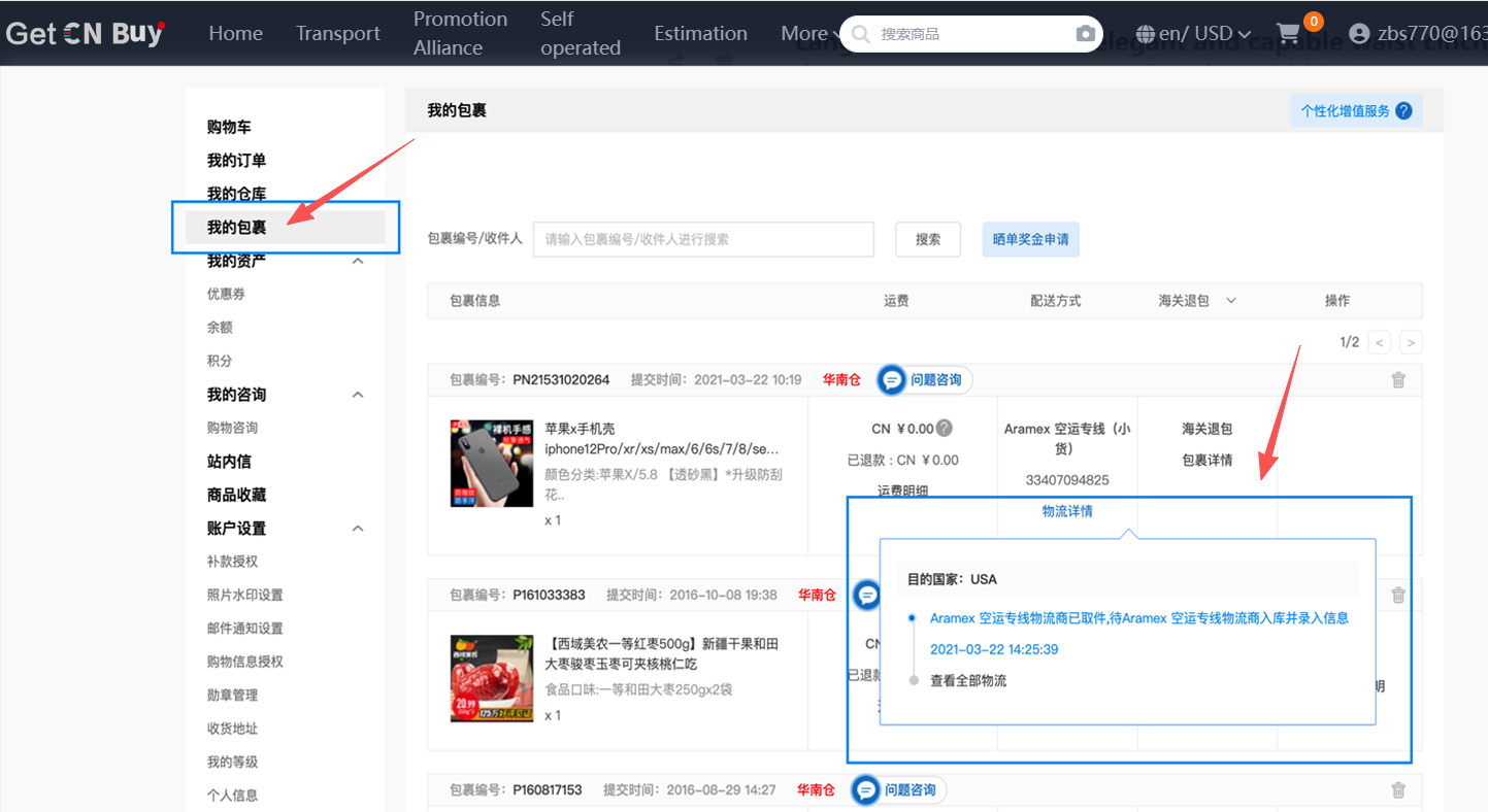 - After shipment, you can view the logistics information in "My GetCnBuy" - "My Parcels"
